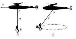 在一次抗洪救灾工作中,一架直升机A用长H=50 m的悬索(重力可忽略不计)系住一质量m=50 kg的被困人员B,直升机A和被困人员B以v0=10 m/s的速度一起沿水平方向匀速运动,如图甲所示.某时刻开始收悬索将人吊起,在5 s时间内,A、B之间的竖直距离以l=50-t2(单位:m)的规律变化,取g=10 m/s2.