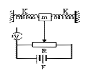 如图所示为一种加速度仪的示意图。质量为m的振子两端连有劲度系数均为k的轻弹簧,电源的电动势为E,不计内阻,滑动变阻器的总阻值为R,有效长度为L,系统静止时滑动触头位于滑动变阻器正中,这时电压表指针恰好在刻度盘正中。求: