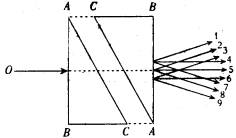 如图所示,两块同样的玻璃直角三棱镜ABC,两者的AC面是平行放置的,在它们之间是均匀的未知透明介质。一单色细光束O垂直于AB面入射,在图示的出射光线中( )