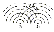 S1、S2是两个相干波源,由它们发出的波相互叠加,实线表示波峰,虚线表示波谷.则对a、b、c三点振动情况的下列判断中,正确的是[ ]