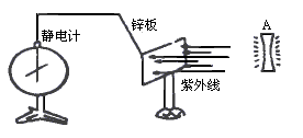 如下图所示,一静电计与锌板相连,在A处用一紫外灯照射锌板,关灯后,指针保持一定偏角:①现用一带负电的金属小球与锌板接触,则静电计指针偏角将________(填“增大”“减小”或“不变”);②使静电计指针回到零,再用相同的钠灯发出的黄光照射锌板静电计指针无偏转,那么,若改用强度更大的红外线照射锌板,可观察到静电计指针________(填“有”或“无”)偏转.