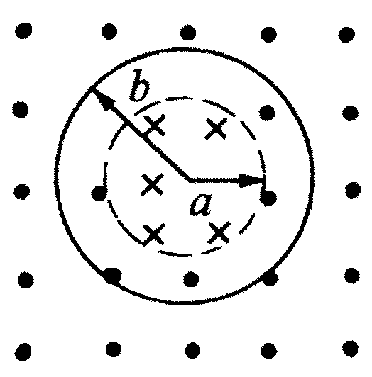 如图所示,空间存在垂直于纸面的均匀磁场,在半径为a的圆形区域,内、外磁场方向相反,磁感强度的大小均为B.一半径为b,电阻为R的圆形导线环放置在纸面内,其圆心与圆形区域的中心重合.在内外磁场同时由B均匀地减小到零的过程中,通过导线截面的电荷量q=________.
