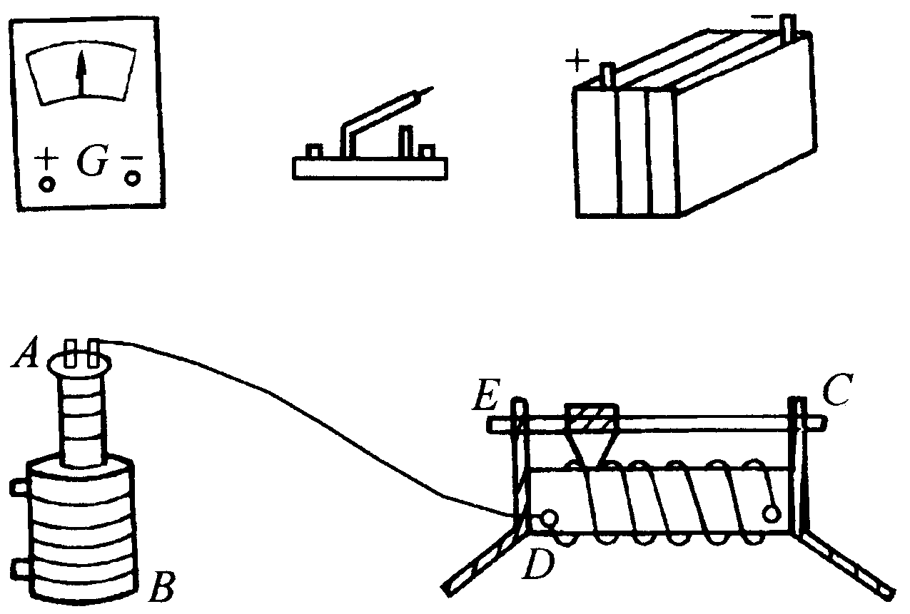 在研究电磁感应现象的演示实验中所用器材如图所示,它们是:①电流计②直流电源③带铁芯的线圈A④线圈B⑤开关⑥滑动变阻器(用来控制电流以改变磁场强弱).试按实验的要求在实物图上连线(图中已连好一根导线).若线圈A从B中拔出时,电流计指针________.当移动滑动变阻器的滑动触头时,电流计指针________,实验说明了______________________________.