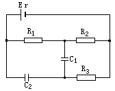 如图所示的电路中,已知E=12V,r=1Ω,R1=3Ω,R2=2Ω,R3=5Ω,C1=4μF,C2=1μF,则C1所带的电量为________C,C2所带的电量为________C.