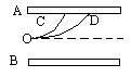 如图,两带电粒子P1、P2先后以相同的初速度v从带电的平行金属板A、B正中央O点垂直于电场线进入匀强电场,偏转后分别打在A板上的C点和D点.已知AC=CD,P1带电量是P2的3倍,则P1、P2的质量比为___________.