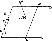 如图,水平放置的光滑金属导轨M、N,平行地置于匀强磁场中,间距为d,磁场的磁感应强度大小为B,方向与导轨平面夹角为α,金属棒ab的质量为m,放在导轨上且与导轨垂直,电源电动势为E,定值电阻为R,其余部分电阻不计,则当电键K合上时,棒ab受到的安培力的大小为________,方向为________,棒的加速度大小为________.