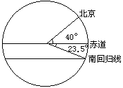 每年冬至日,阳光直射南回归线(南纬),如图所示。北京位于北纬,北京地区在冬至日的正午,把长1m的直杆竖立在水平地面上,它在地面上的影子多长?