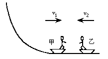 如图,甲、乙两人各乘一辆冰车在山坡前的水平冰道上游戏,甲和它的冰车总质量m1=40kg,从山坡上自由下滑到水平冰道上的速度v1=3m/s;乙和它的冰车总质量m2=60kg,以大小v2=0.5m/s的速度迎面滑来,若不计一切摩擦,问小车即将相碰时,甲的推力对乙做功在什么范围内,才能使两车分开,并且在原直线上运动不再相碰?
