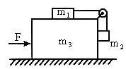 如图所示的三个物体,质量分别为、和,带有滑轮的物体放在光滑水平面上,滑轮和所有接触面的摩擦以及绳子的质量均不计.为使三个物体无相对运动,水平推力F应等于多少?(连接的绳子竖直)