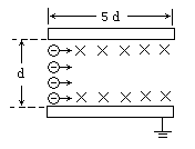 如下图所示,两块长度均为5d的金属板,相距为d,平行放置,下板接地,两板间有垂直纸面向里的匀强磁场,一束宽为d的电子束从两板左侧垂直磁场方向射入两板间,设电子质量为m,电荷量为e,入射速度为v0.要使电子不会从两板间射出,求匀强磁场的磁感应强度B应满足什么条件?
