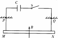 如图所示,质量为m,长为L的均匀金属棒MN通过两根导线悬挂在绝缘支架P、Q上,两根悬挂导线又与充电电压为U,电容为C的电容器及开关相连接,整个装置处在竖直向上的磁感应强度为B的匀强磁场中,先接通开关S,当电容在极短时间内放电完毕时,再立即断开开关S。求金属棒能摆起的最大高度是多少。(设PM足够长)