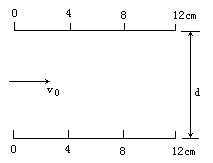 在真空中速度=6.4×的电子束连续地射入两平行极板之间,极板长度L=0.12m,间距d=5.0×,两极板不带电时,电子束将沿两极板之间的中心线通过.在两板上加一交变电压u=91sin100πt(V),若不计在极板间电子间相互作用力,且电子电量为q=1.6×,电子质量m=9×,试在下图中画出电子束可能在两极板间出现的区域,请用斜线表示(要求比较准确地表示一些特殊点,并设电子与极板碰撞,全部被极板吸收不发生反弹).
