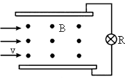 如图所示为磁流体发电机示意图,其中两极板间距d=20cm,磁场的磁感应强度B=5T,若接入额定功率P=100W的灯泡,灯泡正常发光,其正常发光时的电阻R=400,不计发电机内阻,求: