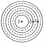 如图所示,由波源S发出的波某一时刻在介质平面中的情形,实线为波峰,虚线为波谷,设波源频率为20Hz,且不运动,而观察者在1s内由A运动到B,观察者接收到多少个完全波?设波速为340m/s,则要让观察者完全接收不到波,他每秒要运动多少米?