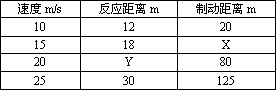 为了安全,汽车在行驶途中,车与车之间必须保持一定的距离,这是因为从驾驶员看见某一情况到采取制动动作的反应时间里,汽车仍然要通过一段距离(称为反应距离),而从采取制动动作到汽车停下的时间内,汽车也要通过一段距离,称为制动距离,下表中列出了在不同速度下的反应距离和制动距离的部分数据,根据分析计算,表中未给出的数据X、Y应是: