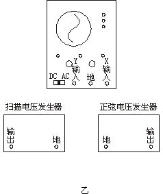 给你一台扫描电压发生器,其输出电压与示波器内部电路产生的扫描电压完全相同.再给你一台正弦电压发生器,其输出电压的频率与扫描电压频率相同.还有示波器和专用导线,要使示波器屏上出现如图甲所示的图形,请用笔画线代替导线,将示波器与扫描电压发生器、正弦电压发生器连接起来,并将“AC、DC”选择开关置于________位置,“扫描范围”选择开关置于________挡.