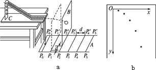 某同学设计了一个研究平抛运动的实验.实验装置示意图如图a所示,A是一块平面木板,在其上等间隔地开凿出一组平行的插槽(下图中P0、P1……),槽间距离均为d.把覆盖复写纸的白纸铺贴在硬板B上.实验时依次将B板插入A板的各插槽中,每次让小球从斜轨的同一位置由静止释放.每打完一点后,把B板插入后一槽中并同时向纸面内侧平移距离d.实验得到小球在白纸上打下的若干痕迹点,如图b所示.