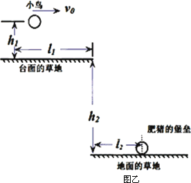 (1)A同学问:如图乙所示,若h1=0.8 m,l1=2 m,h2=2.4 m,l2=1 m,小鸟飞出能否直接打中肥猪的堡垒?请用计算结果进行说明.(取重力加速度g=10 m/s2)