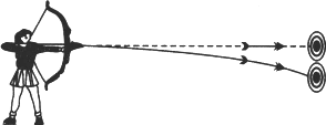 如图中,靶心与待水平射出的箭等高.若靶子固定,水平射出的箭能击中靶心吗?实践证明,在箭水平射出的同时,让靶子自由下落,则箭恰好击中靶心,这是为什么?(忽略空气阻力)