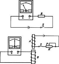 在“研究电磁感应现象”的实验中,首先按下图接线,以查明电流表指针的偏转方向与电流方向之间的关系;当闭合S时,观察到电流表指针向左偏,不通电时电流表指针停在正中央.然后按下图所示将电流表与副线圈B连成一个闭合回路,将原线圈A、电池、滑动变阻器和电键S串联成另一个闭合电路.