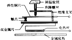 常温下,上下触点接触;温度过高时,双金属片发生弯曲使上下触点分离