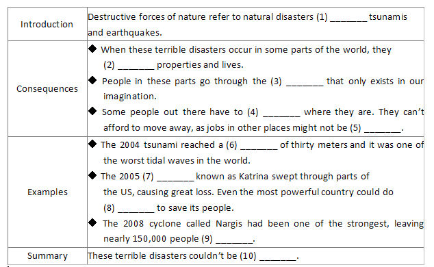 ◆ The 2004 tsunami reached a (7) _______ of thirty meters and it was one of the worst tidal waves in the world. ◆ The 2005 hurricane known as Katrina swept through parts of the US, causing great loss. Even the most powerful country could do (8) _______ to save its people. ◆ The 2008 cyclone called Nargis had been one of the strongest, leaving nearly 150,000 people (9) _______. |
