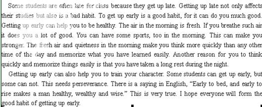 3. 早起是一种好习惯,因为它能给你带来很多好处。早起有助于身体健康,有助于学习,有助于品德培养。英国有句俗话,“Early to bed, and early to rise makes a man healthy, wealthy and wise.”这是千真万确的,希望大家养成早起的习惯。