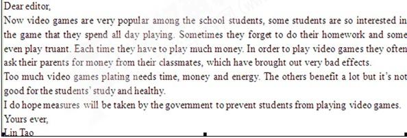 ×÷ΪһÃûÖÐѧÉú£¬Ãû½ÐÁÖÌΣ¬Äã¶Ô²¿·ÖͬѧÃÔÓÚÍæµç×ÓÓÎÏ·(video games)µÄÏÖÏóºÜ׿±£¬±ãÏòÒ»¼ÒÓ¢Îı¨Éç±à¼²¿¼ÄÁËÒ»·âÐÅ£¬²ûÊöÁËÍæµç×ÓÓÎÏ·»úµÄ»µ´¦¡£