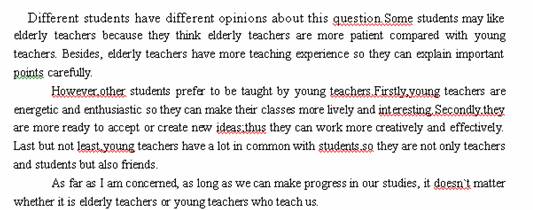 某中学生英语报社正开展一场题为“Young teachers or elderly teachers,which do you prefer?”请你依据下面表格所提供的要点写一篇短文,向该报社投稿。