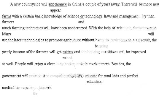 A new countryside will appearance in China a couple of years away. There will be more new farms with a certain basic knowledge of science or technology, laws and management. By then much farming techniques will have been modernized. With the help of scientists, farmers would use the latest technologies to promote agriculture without harm the environment. As a result, the yearly income of the farmers will get raising and the housing conditions will be improved as well. People will enjoy a clean, tidy and an orderly environment. Besides, the government will provide free compulsory(强制的) educate for rural kids and perfect medical care system farmers.