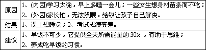 | д×÷¡£ ×î½üµÄÒ»ÏîÑо¿±íÃ÷£¬ÉÇÍ·´óÔ¼50£¥µÄÇàÉÙÄêÓв»³ÔÔç²ÍµÄϰ¹ß¡£ Çë¸ù¾Ý±í¸ñÄÚÈÝÓÃÓ¢Óïдһƪ¶ÌÎÄ¡£