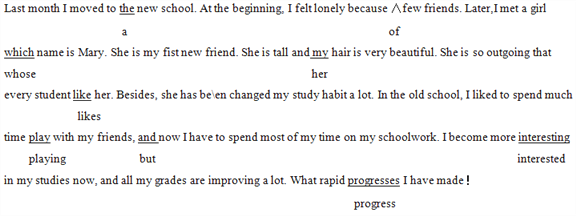 Last month I moved to the new school. At the beginning, I felt lonely because few friends. Later,I met a girl which name is Mary. She is my fist new friend. She is tall and my hair is very beautiful. She is so outgoing that every student like her. Besides, she has been changed my study habit a lot. In the old school, I liked to spend much time play with my friends, and now I have to spend most of my time on my schoolwork. I become more interesting in my studies now, and all my grades are improving a lot. What rapid progresses I have made!