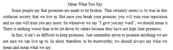 有人说承诺就是许下来违背的。这种情形在我们这个竞争激烈的社会里似乎很常见。但是如果你违背你的诺言,就会……。请你以“Mean what you say”为题写一篇100字左右的记叙文或议论文,说明诚实守信的重要性。