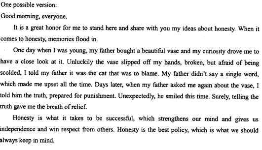 假如下周你校将组织一次以“Honesty”为主题的演讲比赛。请你结合生活中的一个事例以及你对honesty的理解,用英语准备一篇演讲稿。