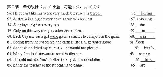 该句错一个词:在错的词下划一横线,在该行右边横线上写出改正后的词。