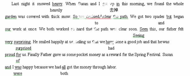 Last night it snowed heavy. When Susan and I got up in this morning, we found the whole garden was covered with thick snow. So we decided clear the path. We got two spades but began our work at once. We both worked so hard that the path was clear soon. Seen this, our father felt very surprising. He smiled happily at us, telling us that we have done a good job and that he was proud for us. Finally Father gave us some pocket money as a reward for the Spring Festival. Susan and I was happy because we had all got the money through labor.