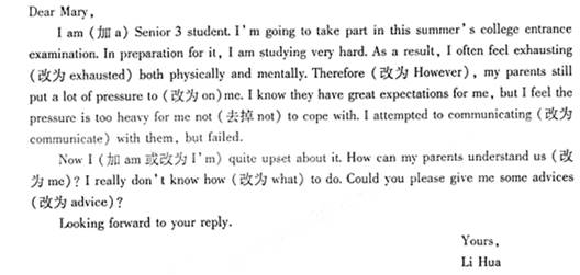 I am Senior 3 student. I¡¯m going to take part in this summer¡¯s college entrance examination. In preparation for it. I am studying very hard. As a result, I often feel exhausting both physically and mentally. Therefore, my parents still put a lot of pressure to me. I know they have great expectations for me, but I feel the pressure is too heavy for me not to cope with. I attempted to communicating with them, but failed.