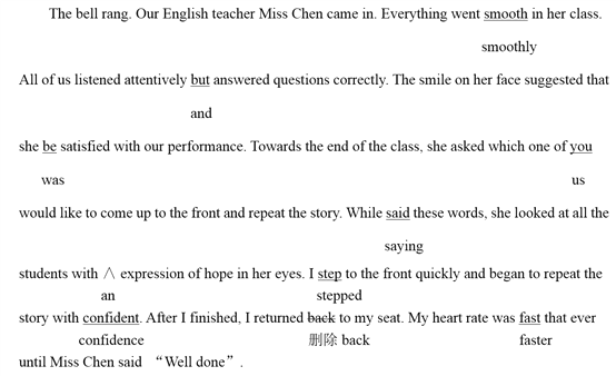 The bell rang. Our English teacher Miss Chen came in. Everything went smooth in her class. All of us listened attentively but answered questions correctly. The smile on her face suggested that she be satisfied with our performance. Towards the end of the class, she asked which one of you would like to come up to the front and repeat the story. While said these words, she looked at all the students with expression of hope in her eyes. I step to the front quickly and began to repeat the story with confident. After I finished, I returned back to my seat. My heart rate was fast that ever until Miss Chen said “Well done”.