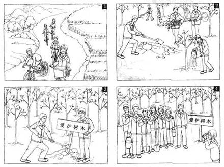 假设你是红星中学高三一班的学生李华,为响应绿化祖国的号召,你班四月十二日去郊区植树,请根据以下四幅图的先后顺序,介绍植树活动的全过程,给某英文杂志的“绿色行动”专栏写一篇以“Green Action in Our Class”为题的英文稿件。