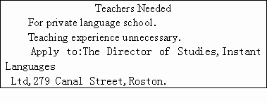 The Kurzweil machine consists of three components:ascanner(扫描仪),a computer,and a voice synthesize(语音合成仪).These three parts are like your eyes,your brain,and your voice.The scanner is the“eye”of the machine.It scans,or looks at the words on the page of a book and changes theminto digital signals.These digital signals then go to the cornputer.the“brain”of the machine.The computer analyzes the signals and recognizes the words.The computer sends information abont the words to the voice synthesizer.The voice synthesizer makes the sounds of the words.