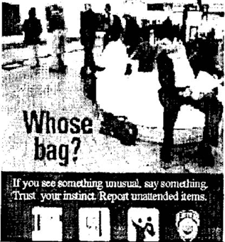 This poster can be found inside a subway car in San Francisco.It reminds commuters for anything they think out of place.The police in charge of the subway system hang up because they are worried about terrorism.An unattended bag could contain a bomb.