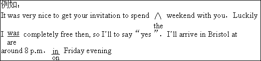 单句改错 该句多一个词:把多余的词用斜线(\)划掉,在该句右边横线上写出该词,并也用斜线划掉。 该句缺一个词:在缺词处加一个漏字符号(∧),在该句右边横线上写出该加的词。 该句错一个词:在错的词下划一横线,在该句右边横线上写出改正后的词。