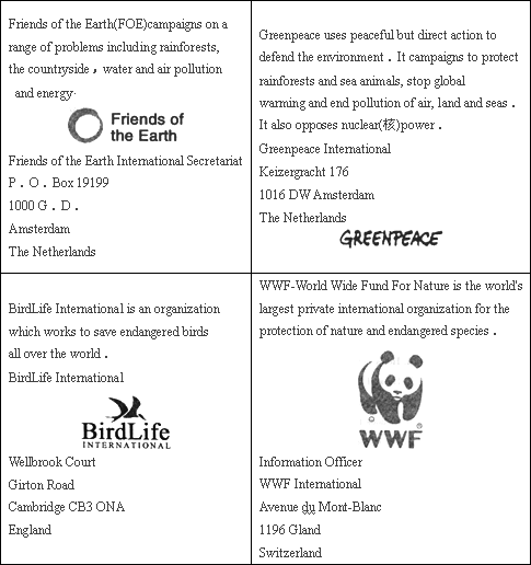 物种)and natural environment.If you would like more information about any of the organizations listed below, you can write to the addresses given.