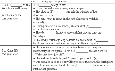 Growing up, one year on It’s been a year since the Wenchuan earthquake, which left many dead and many more upset and scared.As the quake areas are now being rebuilt, do students feel better, and what are their lives like? Teens have talked to two students to find out.Wu Xinnan, 16,