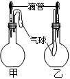 如图所示的甲、乙两个装置中,胶头滴管中吸入某种液体,平底烧瓶中充入(或放入)另一种物质,挤压胶头滴管加入液体,一段时间后两装置中的气球都有明显地胀大(忽略液体体积对气球的影响)。则下列各组不合理的是 ( )