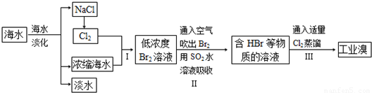 (3)步骤Ⅱ用SO2水溶液吸收Br2,使溴蒸气转化为氢溴酸以达到富集的目的.其反应的化学方程式为Br2+SO2+2H2O=H2SO4+2HBr,在该反应中,氧化剂是______(填化学式).若反应中生成2molHBr,则消耗______molSO2,若完全吸收后的酸溶液体积为500mL,则溶液中氢离子浓度为______mol/L.