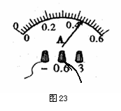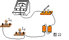 小明同学做“用电流表测电流”实验的电路如图22所示,请用笔画线代替导线将电路连接完整,使灯L1和L2并联连接,电流表测量通过灯L1的电流,并在虚线框内画出对应的电路图。闭合开关后,电流表的指针如图23所示,则通过L1的电流为_________A。若干路上也有相同规格电流表一只,且指针偏转与23图相同,则干路电流为_________A,L2的电流为_________A。
