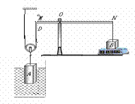 如图是利用电子秤显示水库水位装置的示意图。该装置主要由不计重力的滑轮C、D,长方体物块A、B以及轻质杠杆MN组成。物块A通过细绳与滑轮C相连,物块B通过细绳与杠杆相连。杠杆可以绕支点O在竖直平面内转动,杠杆始终在水平位置平衡,且MO:ON=1:2。已知物块A的密度为1.5×103kg/m3,底面积为0.04m2,高1 m,物块B的重力为100N。滑轮与转轴的摩擦、杠杆与轴的摩擦均忽略不计,求:![]()