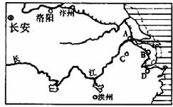 14.下图为隋唐时期局部图。A、B、C、D四城市中,同时以陶瓷和纺织品著称的是( )