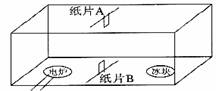 32.在一个长、宽、高分别为2米、1米和1米且六面都封闭的透明玻璃柜内,底面两侧分别放置一个电炉(有导线连到柜外)和一大盆冰块。在玻璃柜顶面中部的内壁贴一张下垂的纸片A,在玻璃柜底面中部的内壁贴一张竖立的纸片B(如下图所示)。在电炉通电一段时间之后,根据纸片A、B的偏动情况,可以模拟验证某一地理原理。(8分)